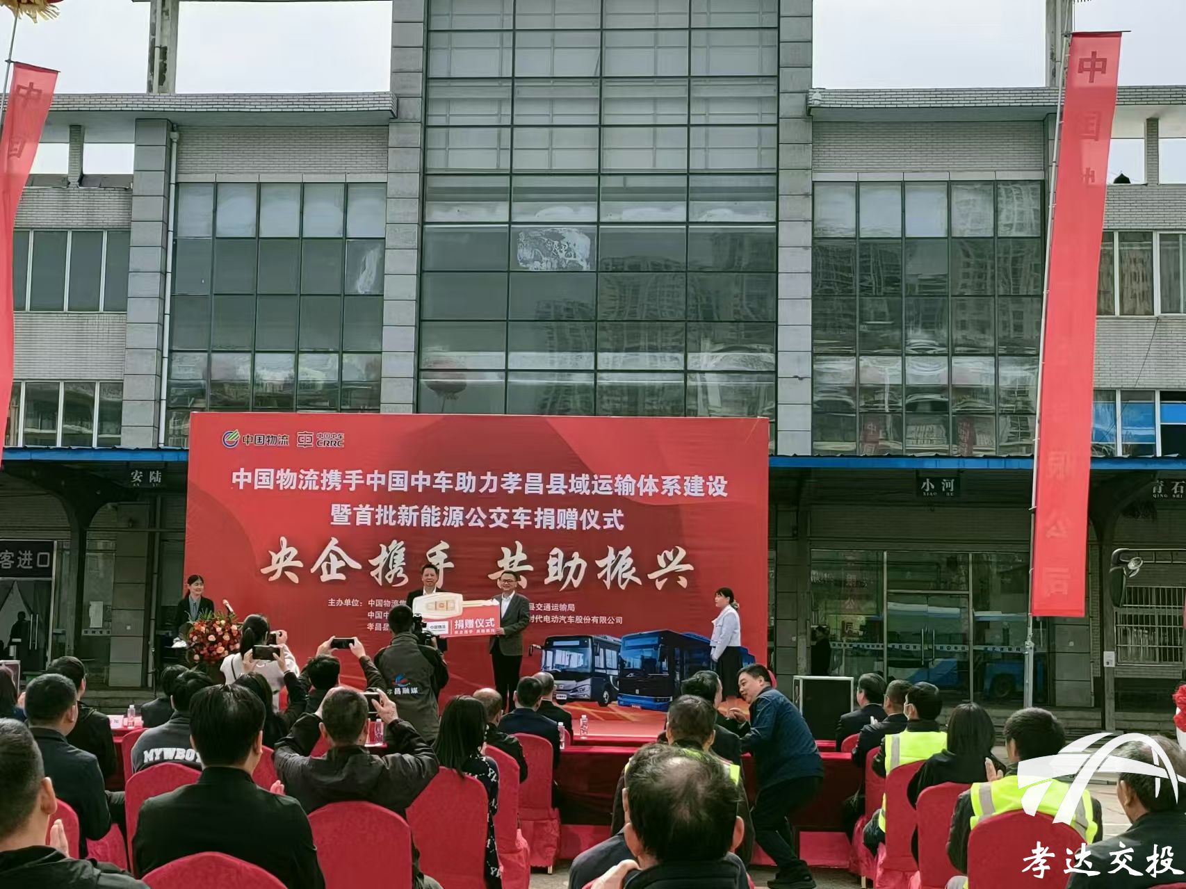 10月22日上午,主題為“央企攜手,共助振興”的捐贈(zèng)儀式在孝昌縣中心客運(yùn)站舉行。中國(guó)物流集團(tuán)有限公司攜手中國(guó)中車集團(tuán)有限公司向孝昌縣暢達(dá)城市公交有限公司捐贈(zèng)了價(jià)值近700萬(wàn)元的12臺(tái)優(yōu)質(zhì)新能源公交車。中國(guó)物流集團(tuán)有限公司、中國(guó)中車集團(tuán)有限公司領(lǐng)導(dǎo),孝昌縣政府及相關(guān)部門(mén)領(lǐng)導(dǎo),湖北孝達(dá)交通投資有限公司及下屬公司等80余人參加了活動(dòng)。——中國(guó)物流集團(tuán)為縣暢達(dá)公交公司捐贈(zèng)新能源公交車